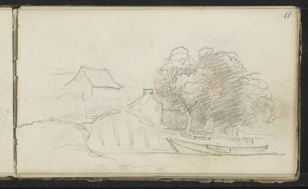 Johannes Tavenraat sketched "Huizen in Hillegersberg" with graphite on paper. Notice how the artist rendered a picturesque scene of houses nestled among trees, evoking a sense of tranquility. The composition is structured around clusters of forms, where sharp, angular roofs contrast with the soft, rounded foliage. Tavenraat's use of hatching creates depth and shadow, giving the scene a three-dimensional quality. We can see a structural interplay of light and dark, which articulates the forms of the houses and trees. This interplay isn’t just representational; it’s expressive. The drawing captures a fleeting moment, inviting us to explore the formal properties of line and tone. These formal choices reveal a deeper interest in how we perceive and construct our sense of place.