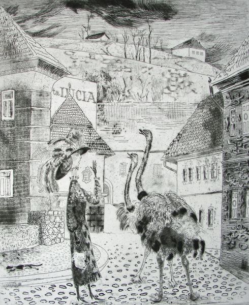 This is Hang the Signboard by Boris Kustodiev, made using what looks like ink on paper. The scratchy lines make me think of process, like he's thinking out loud with his pen. I really like how he's built up the scene using just these little marks. Look at the roof of the house – it's all these tiny, broken lines, but together they give you this sense of a heavy, snow-covered surface. And then there’s the lettering on the sign, how it seems to pop out against the dark background, almost like a separate element pasted on. It makes me think about the physicality of the medium, the way the ink sits on the page. You can almost feel the pressure of his hand as he drew each line. It’s interesting to think about Kustodiev’s other work, which is often so colorful and full of life, and then to see this more restrained, almost graphic piece. It reminds me of someone like Käthe Kollwitz, who also used black and white to such powerful effect, conveying a sense of stark reality. Ultimately, it's this contrast, this tension between simplicity and depth, that makes the piece so compelling.