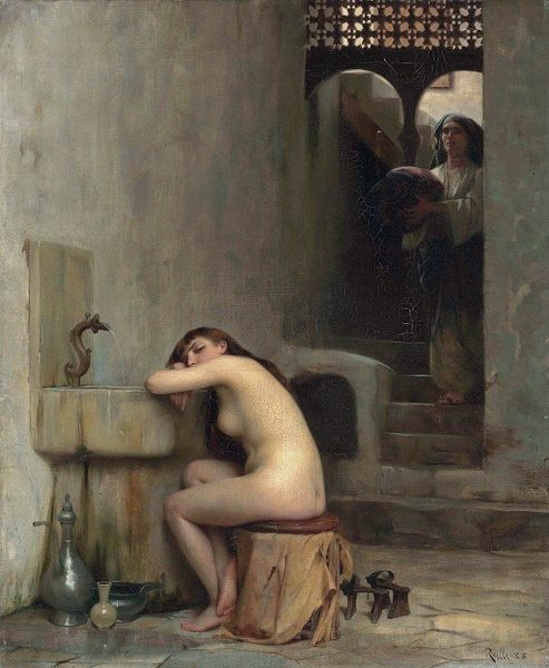 Léon François Comerre painted this enigmatic scene with oil on canvas, a traditional medium lending itself to the luxurious textures and lighting on display. Consider how the choice of oil paint, carefully layered and blended, allows Comerre to capture the sensuousness of the scene. Look at how light catches the folds of the blue cloth and the smooth skin of the figure. These effects depend entirely on his skilled handling of the material. The painting's labor is obscured. Instead, we get seductive textures, all possible because of oil paint’s unique capacity for glazing, blending, and illusionistic detail. The detailed depiction of the surroundings, from the carved stone walls to the ornate fan, further contributes to the painting's overall opulence. By focusing on materials and process, we can appreciate not just the aesthetic qualities of the work, but also the labor and skill involved in its creation, offering a richer understanding of its cultural significance.