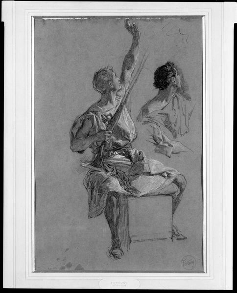 Curator: Augustin Alphonse Gaudar de Laverdine's drawing, "Manlius Torquatus Condemning His Son to Death," presents a seated figure in charcoal and graphite. Editor: The severe lines and stark contrast really emphasize the gravitas of the moment. It’s a figure caught between duty and something profoundly personal. Curator: Indeed, the artist uses the draping fabric and strong diagonal of the arm to guide the viewer’s eye, creating a dynamic yet restrained composition. The gesture is everything. Editor: And what a gesture! It's the weight of Roman justice, the father’s internal conflict playing out in the symbolic language of power and sacrifice. Curator: The classical references are clear, of course, but it’s the psychological tension created by the stark lighting that I find most compelling. Editor: It's a powerful exploration of conflicting loyalties. Curator: A masterclass in visual economy. Editor: A chilling glimpse into the price of conviction.