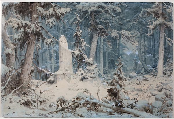 Clarence Gagnon made this painting, Trapper in the Woods, sometime during his career as a Canadian painter. This image of a lone trapper and his dog in a snow-covered forest is more than just a scene, it's a commentary on the evolving relationship between humans and nature. Painted during a period of rapid industrialization in Canada, Gagnon’s work invokes the traditional lifestyle of the trapper as a symbol of a past way of life. The trapper, dwarfed by the imposing forest, embodies the struggle for survival in a harsh environment. The painting romanticizes the rugged individualism of the trapper, a figure who lived outside the constraints of modern society. To truly understand this work, one might consult historical records, literature, and other cultural artifacts from this era. The meaning of art is always conditional on social and institutional context, making the art historian’s role vital.
