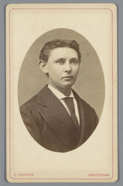Curator: Looking at this gelatin-silver print from between 1870 and 1891, titled "Portret van een onbekende man"—Portrait of an Unknown Man—I’m struck by how it encapsulates the photographic conventions of the late 19th century. Editor: There's a certain somberness to it, isn’t there? He almost seems defiant, like he’s challenging the viewer. The monochrome palette really amplifies that feeling. Curator: It does, and it reflects how photography at the time became increasingly accessible and standardized. Consider how such portraits functioned in society—as markers of status, lineage, or perhaps as keepsakes for loved ones separated by distance. It played a vital role in solidifying social identities. Editor: That’s fascinating. He seems aware of being looked at, but I wonder what being "unknown" meant for this image and others like it. It strips him of his specific identity, but also perhaps invites us to see him as representative of his time. Does the lack of attribution alter the value or meaning we can extract from it? Curator: Absolutely. The lack of a known subject opens up interpretive space, forcing us to grapple with broader questions. This work reflects a moment in time, both personally for the subject and professionally for Dirk le Grand. Its survival also hinges on the very institutions we represent. Museums collect, display, and ultimately determine the historical significance attributed to such works. The art world is just one more layer added on this piece. Editor: So the meaning we attach to him is built not just by his expression or attire but also by the social frameworks surrounding this photograph's existence and trajectory. As someone standing outside traditional art institutions, I wonder how the dominant narratives shape how we perceive even an image so seemingly simple as this one, an "unknown man." Who gets remembered, who is left behind, and who decides? Curator: It is those very frameworks, I believe, that allow us to question what survives into the public's view and becomes considered art. I believe that without the understanding of where the piece came from it changes the context we approach the artwork with. Editor: I agree completely. It serves as a reminder of whose stories are often marginalized. We need a multi-pronged approach when looking at these portraits as it might show new and previously obscured histories.