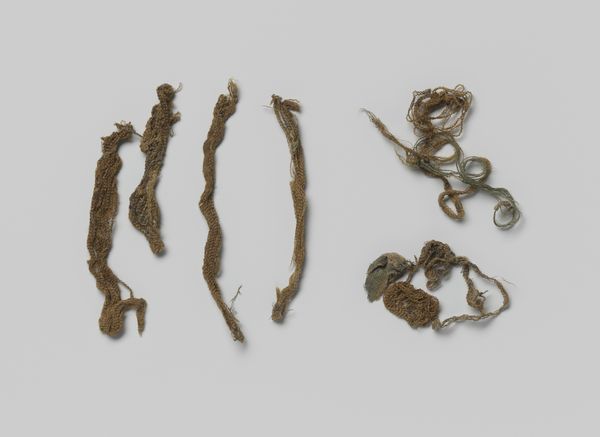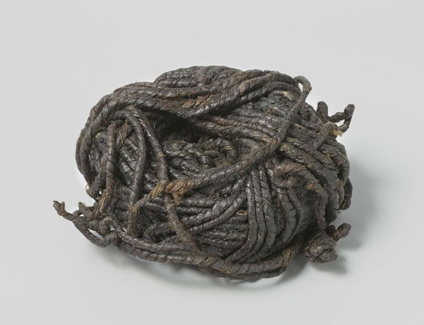 Editor: This photograph, simply titled "Touw," which is Dutch for "rope," dates from around 1590 to 1596. It’s credited to an anonymous artist and resides in the Rijksmuseum. I’m struck by the arrangement of the different ropes; it’s almost like a portrait of labor. What catches your eye about it? Curator: Well, the subject of the photograph itself is rope - a fundamental tool tied to labor and maritime history in the Dutch Golden Age. I'm interested in how the photographer – despite being anonymous – chose to present this everyday object. How might the process of rope making, the gathering and twisting of fibers, reflect the socio-economic structures of the time? Editor: That’s an interesting point. I hadn't considered the connection between the literal construction of the rope and the social construction of the time. The variation in texture also suggests different uses or stages of production. Curator: Precisely. Consider the contrast between the neatly coiled ropes and the frayed ends. Is the artist highlighting the cycle of production and consumption? This era in Dutch history was defined by its maritime dominance. Editor: So, you’re suggesting that these seemingly simple objects represent a much larger network of trade and labor? The tools on the ends of two of the ropes also bring a metallic element to what I otherwise thought to be a purely "natural" composition. Curator: Absolutely. It provokes us to ask: Where did the raw materials come from? Who spun the rope? And what vessels did this equip? Even further, think about photography's process—how light acts upon chemicals to create an image of these labor tools. In turn, it brings another set of means and labor into play, reflecting the everchanging nature of making. Editor: I see what you mean. I initially just saw ropes, but now I see an intricate web of human activity and materiality captured in a single image. Thank you! Curator: My pleasure. Looking at art from the standpoint of its materials really opens a wealth of information.