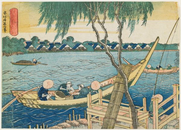 Curator: This is Kobayashi Kiyochika’s 1881 woodblock print, “Night on the Sumida River.” What’s your first impression? Editor: The somber tonality strikes me first. It's very muted. I can almost feel the cool dampness of the evening air and hear the water lapping against the shore. Curator: The atmospheric perspective is skillfully rendered through variations in the shade and lightness. Kiyochika evokes this almost monochromatic mood, typical of ukiyo-e, using the natural variations in tone produced by the woodblock printing. It accentuates flatness rather than illusionism. Editor: Right, because the Sumida River was historically a vital social space in Tokyo. These nighttime scenes weren’t just picturesque—they reflected contemporary urban life and its increasingly Western influences, evident in the gentleman’s attire, for example. I would hypothesize that the print speaks to modernization, as the Sumida was an integral transportation and economic route within Tokyo, wouldn’t you agree? Curator: Exactly. Note the subtle play of light – it animates the scene. The artist uses reflected light to direct the eye toward the silhouetted figures walking. These verticals draw attention to the human figures' place within this scene. Their presence offers a scale and grounds us. Editor: Speaking of, I find their anonymity so interesting. Are they even meant to be specific individuals? It’s almost like Kiyochika uses them to stand for any inhabitants who enjoy their daily lives by the Sumida. What is interesting to me is that he chooses this moment of quiet, which emphasizes the public availability of this enjoyment, so as to highlight the fact that they still occur even during the transitional period from pre-Meiji to post-Meiji restoration. It suggests both continuity as much as change. Curator: Precisely! The print uses this interplay of light and shadow to guide the viewer’s eyes through an ordered but not prescriptive narrative. Editor: Yes, and I like that your focus allows us to see how he manages to incorporate cultural values, beliefs, and societal structures through his medium. That’s crucial. Ultimately, he uses the scene on the Sumida to demonstrate cultural heritage! Curator: And on the other hand, I have attempted to emphasize his technique to expose Kiyochika’s artistic intentions.