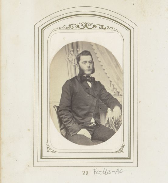 Curator: This vintage photograph, believed to be captured between 1866 and 1869 by H. Jaeger & Co, is titled "Portret van F.H.P. Ligtenberg in een lange jas met een gestreepte broek en een wandelstok." It's quite a mouthful, isn't it? Editor: Indeed! My first impression? It's a portrait bathed in sepia nostalgia, with that slightly unnerving stillness you often find in older photos. Almost like a ghost sitting there, looking straight at us from across time. Curator: Precisely. And that "ghost" is F.H.P. Ligtenberg, presumably a prominent figure in his time, given the formality of the portrait. I'm particularly interested in the performativity of masculinity on display, even in such early photography. Notice his poised demeanor, the tailored jacket, the striped trousers. It’s a very curated image. Editor: Curated indeed! Look at that swagger stick. It's almost screaming, "I've arrived!" And there's a softness there too. It could be the sepia tones softening everything, or it's his eyes that speak volumes. There's wisdom, sure, but also a little bit of melancholy maybe? Or indigestion! Hard to say. Curator: Or perhaps just the pressure of the photographic process. These early exposures took time. But beyond individual expression, I think we can examine the societal norms reflected here. The strict codes of dress, the subtle markers of status – all contributing to our understanding of the period's social hierarchies and cultural values. The rise of photography intersects here with questions about the formation of class and individual identities. Editor: You’re so right! It’s easy to romanticize the "olden days," but underneath all the vintage charm, there were hierarchies and injustices aplenty. That is an idea that bears constant reminder! He becomes a reminder of time's passage, sure, but also of societal frameworks which defined and often constrained our predecessors. The photograph reminds me that even seemingly static images can tell dynamic stories. Curator: Absolutely. Examining pieces like this provides essential critical insights into the matrix of identity, race, gender, and politics defining the cultural landscapes of yesterday. Editor: For me, it sparks a daydream. About his life, about that studio, about what became of that funky chair! It is kind of perfect that an old picture keeps creating new reflections! Curator: A fascinating journey, indeed. Editor: Indubitably!