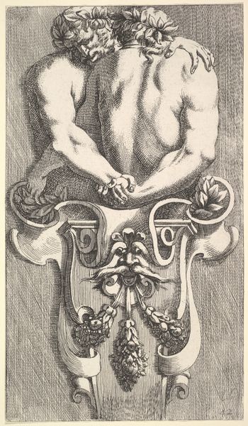 Curator: Here we have a 17th-century engraving by Jean Le Pautre entitled, "Design for a Term with Two Bacchic Figures." It's part of a larger series called "Curieuses recherches de plusieurs beaus morceaus d'ornemens antiques et modernes." Editor: Intensely classical, isn't it? The musculature is quite powerful for an engraving, but those faces… quite forbidding. Almost grotesque. Curator: Grotesque, maybe, but appropriately Bacchanalian. These are followers of Bacchus, the god of wine and ecstasy. Notice the wreath of grapes and vines adorning their heads—hallmarks of Dionysian revelry. Editor: The material execution itself is quite captivating. It’s a print, so mass production was absolutely the purpose, right? It would have served as inspiration for other artisans in the creation of, well, other terms! And I am compelled to see in what precise material, this engraving will finally reappear, maybe in plaster, maybe in marble? Curator: Exactly! Le Pautre disseminated his designs to a wide audience of artisans and craftsmen. The image depicts more than just inebriated characters. This is about control and manipulation of classical motifs for a booming market, and the clever design would lend itself to diverse applications. Editor: So, considering the material then, it's function would dictate it to eventually serve an ornamental function for perhaps garden designs or architectural embellishments. So these "terms"– the kind we're seeing depicted– these are not only artworks themselves but components, part of something greater. Curator: Precisely. The design emphasizes movement—the intertwining figures, the swirling acanthus leaves. Le Pautre created an object of desire that blends classical learning with a distinct Baroque dynamism intended to meet consumption demands. It's also interesting how a tassel at the bottom suggests how sculpture integrates domestic, even intimate, spaces. Editor: Yes, this combination truly reveals both continuity and shift in the symbolic repertoire. From classical antiquity re-imagined through Le Pautre's hand in the 17th century to a modern museum installation today. History never ceases to reshape what these Bacchic figures could mean to us. Curator: And I am left to ponder: How will Le Pautre’s images resurface tomorrow? The endless chain of inspiration and reproduction. Editor: Absolutely, seeing them here invites us to wonder at this legacy – where might such potent figures reappear next, bearing their timeless and compelling messages.