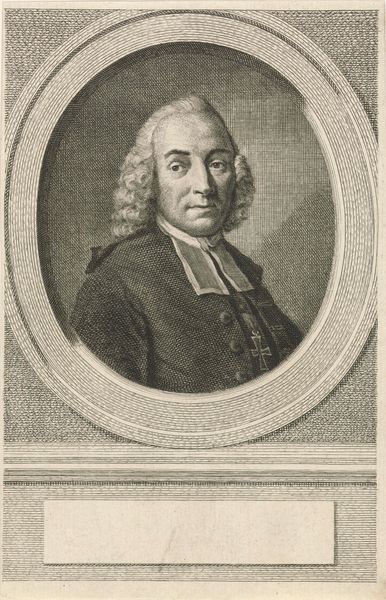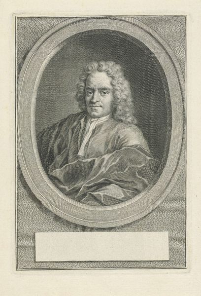 Editor: Here we have Jacob Houbraken’s “Portret van Cornelis Hop,” an engraving from sometime between 1747 and 1759. The details are so fine; I’m struck by the formality of it all, the wig, the frame around the portrait itself. What does this say about how portraits like this functioned in society? Curator: Good question! This portrait wasn't just about capturing a likeness. It was deeply intertwined with social status and power. Cornelis Hop, judging by his attire and the artistic style, likely belonged to the Dutch elite. These kinds of images helped solidify social hierarchies. Who was deemed worthy of being portrayed and how that portrayal was distributed reinforced existing power dynamics. Notice the blank space beneath the oval? Editor: Yes, I see it. It seems intended for some sort of inscription. Curator: Exactly. And inscriptions usually added to the person's credentials, achievements, further cementing their importance in the eyes of the public. It controlled the narrative, shaped the historical perception. Editor: So it's almost a form of... propaganda, perhaps? Promoting a certain image of authority? Curator: The word propaganda carries certain negative connotations for us today. But, certainly, these prints promoted and maintained specific values. It's important to remember how these images circulated; as prints, they were more accessible than painted portraits, playing a key role in shaping public opinion, or at least influencing those who were consuming art and intellectual ideas at the time. Editor: I see what you mean. It’s fascinating how much history is embedded in this single print. I wouldn’t have considered the print’s purpose beyond the individual depicted. Curator: It’s precisely that broader cultural context that helps us to truly understand and appreciate works of art.