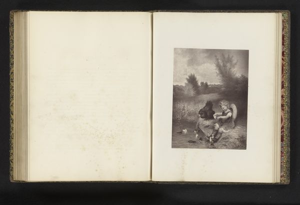 Curator: This etching, dating from before 1871, is a photoreproduction of an engraving of the painting “The Village Rose” by Thomas Brooks, based on a portrait by Godfrey Wordsworth Turner. It seems fitting to reflect upon the romantic themes presented to us within. Editor: It's rather…charming. The kind of sweetness that makes you want to roll your eyes but also sort of… sigh dreamily? The soft light filtering through the trees definitely sets a mood, doesn't it? What symbols or meanings strike you when you see the work, considering this cultural lens? Curator: Well, it’s titled “The Village Rose.” That tells me a lot. The rose is practically synonymous with romantic love, especially when placed, as it is here, in a village setting implying idyllic innocence. Consider their positioning – she leans ever so slightly upon his arm, a gesture of tentative trust perhaps? A garden path opens behind them leading back towards a brighter space, which represents their journey in life. The landscape speaks, not of rugged individualism or urban strife, but of gentle nurture and budding sentiment. Editor: Absolutely, I agree; the visual language is really fascinating. Note that while they’re linked physically, she has one hand free and unlinked, suggesting some freedom and a bit of emotional complexity. He holds some simple flowers for her. Those blossoms speak to love, of course, but consider also how fleeting they are. What we see in a seemingly sweet genre-painting speaks of the transient nature of youth and beauty, as well as the very delicate thread that true romance is built on. It hints to me at unspoken fragility in the promises made between lovers and within social hierarchies. Curator: It’s true that we find potent commentary. The clothing of these characters suggests an air of cultivated taste. They're clearly a step above mere peasants, a critical indicator for interpreting their social role and significance. The image is also a photo-reproduction, an attempt to make the original accessible and commonplace by its means of production. Editor: What really stays with me is that quiet tension between idealized romance and the whisper of reality; it gives the whole thing a real edge. Makes you wonder about what happened after they wandered down that garden path, eh? It’s as if both artists are inviting viewers to consider the interplay of dreams, truth, tradition, and beauty... Curator: And isn't that what we're always striving for? Truth, after all, is as good as a rose.