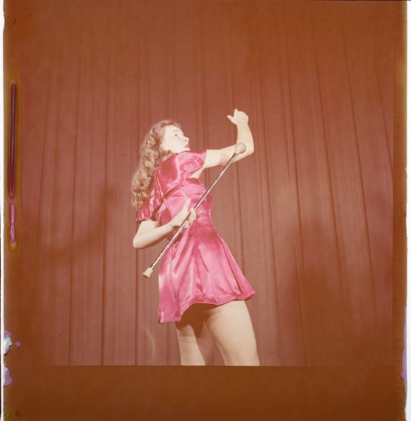 Curator: This gelatin silver print by Jack Gould, simply titled "Untitled (baton twirler)," presents a young woman mid-performance. What is your initial take on this image? Editor: There's a striking theatricality. The backdrop, the pose…it evokes a very particular era of American performance and adolescence. Curator: It makes me think of the labor involved in image-making, the chemical processes and the social expectations surrounding photography at the time this was produced. Editor: Definitely, but beyond the process, notice how the red of the dress, paired with the stark white boots, creates a visual vocabulary of power and innocence. Almost a hyper-feminine archetype. Curator: I agree there are interesting power dynamics at play. I wonder what kind of consumption motivated this image. Was it a professional shot, or something more personal? Editor: It encapsulates a very specific moment, and prompts me to consider the broader cultural context. Curator: Thinking about the artist's choices regarding materials and production expands how we view the subject. Editor: It's fascinating how Gould's image resonates with so much meaning. Curator: Indeed, a photograph can invite many interpretations.