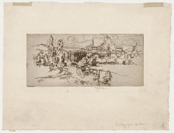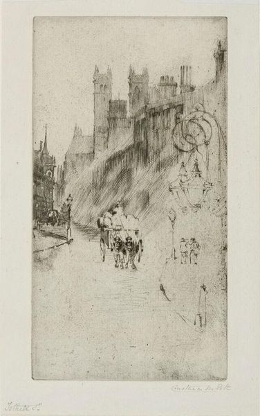 Editor: This is Joseph Pennell’s etching, "New York from New Jersey," created in 1915. The stark contrast between the industrial foreground and the distant, almost dreamy, cityscape feels really poignant. How do you interpret this work? Curator: Pennell’s work often reflects the rapid industrialization of the early 20th century, but through a critical lens. I see in this print not just a celebration of progress, but a commentary on its social and environmental costs. Note the prominent placement of the train tracks and factories; they almost seem to overshadow the skyscrapers. Editor: So, the artist isn’t simply admiring the skyline? Curator: Exactly. Consider who benefits from this "progress" and who bears the brunt of its consequences. The workers commuting, the pollution billowing – these are not neutral elements. Pennell is engaging with questions of power and social justice through his art. Do you notice anything about the composition that might reinforce this reading? Editor: Well, the viewpoint is from New Jersey, placing us, the viewers, somewhat outside of the gleaming towers of New York. Maybe it’s suggesting an outsider perspective? Curator: Precisely! This distance allows for a critical examination. Think about how urbanization often marginalizes certain communities. How does that reading change your view of the artwork? Editor: It makes me think about urban planning and how it shapes our lives, often unequally. I initially saw beauty in the skyline, but now I recognize the artist is pushing me to consider the implications behind that beauty. Curator: Yes, and by understanding this artwork’s social context, we can have a more nuanced conversation around issues that remain incredibly relevant today. Editor: I'll definitely look at Pennell's other works and those of his contemporaries, through this activist lens. Thank you!