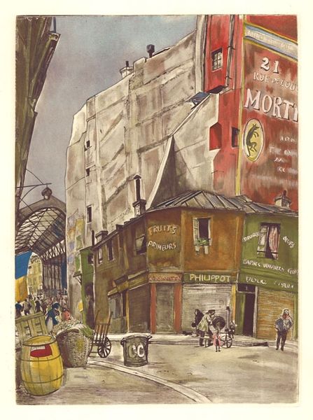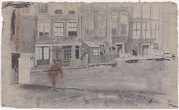 Curator: Looking at "Le boulevard Edgar-Quinet" by Tsuguharu Foujita, I can’t help but feel a profound sense of stillness amidst the implied urban bustle. Editor: My first impression is that it feels incredibly crafted. There's something deliberate in the layering of washes; you can sense the hand working through the materiality of paint, ink, and watercolor. What do you think? Curator: Absolutely! It's like Foujita invites us to consider the essence of Parisian architecture through this lens of handcrafted art. The building's texture is so tangible; it is an invitation to look beyond the facade. And do not forget his signature: an echo, in his own way, of the great Japanese printmakers who stamped their mark. Editor: Right, I agree! Consider the implications of applying watercolor and ink to a cityscape. It isn’t a straightforward act of rendering a scene. It transforms urban labor, the daily grind of Parisian life, into a controlled studio practice of material manipulation and compositional strategy. And those shutters--the number of cuts required! Curator: Yes, you put your finger on something. And the colors! The limited palette pushes the viewer to find beauty not in the grand spectacle of color but in the subdued, subtle modulations of light and shadow. Perhaps it mirrors his internal search, a meditative reflection cast upon the buildings that line the street. The trees too, so gaunt—they strike an elegiac note. Editor: Totally. When looking at Foujita's treatment of this slice of urban existence, consider the accessibility of his chosen materials, ink and watercolor—simple, quotidian, yet capable of depicting grand spaces and a bustling sense of everyday commerce. They elevate what might be deemed simple to the realm of profound artistic inquiry. Curator: Indeed, it encourages us to meditate on the city, to peel back the layers of stone and stories to reveal the souls intertwined with its existence. In a city so often defined by grandeur, Foujita illuminates its tender core. Editor: To view Parisian life through the application of humble materials underscores how Foujita redefined what it meant to render "the street" using accessible methods and how Foujita used common materials to reveal profound observations of life, labor, and light.