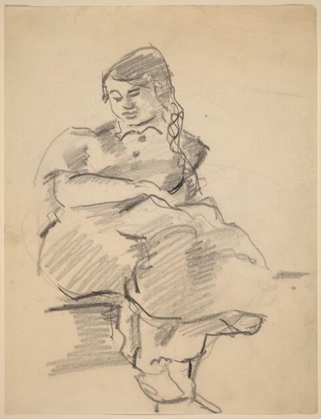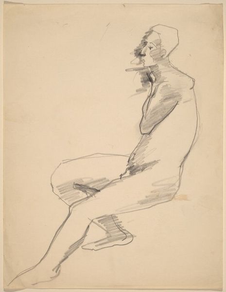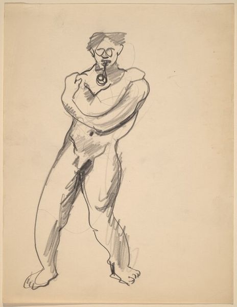 Editor: Here we have Mark Rothko's pencil drawing, "Standing Female with Arms Clasped Behind Back". It has an unfinished quality that lends it a very vulnerable feeling. What strikes you about this piece? Curator: The clasped hands behind the back immediately suggest restraint, perhaps even a societal constraint on female expression, echoing historical periods where women's autonomy was limited. Do you notice how the sketch's lines, though simple, create a figure that appears burdened? Editor: Yes, the lines around the shoulders and head seem heavier than the rest of the figure. I almost feel a sense of shame emanating from her posture. Curator: Indeed. The averted gaze, absent facial features—all amplify this sense of internalized pressure. Rothko often used the human form to convey fundamental emotional experiences. How do you think this image relates to broader themes of identity and self-representation? Editor: I see a timeless struggle – an individual battling societal expectations. It's compelling how a few pencil strokes can evoke so much internal conflict. Curator: It's remarkable, isn't it? The lack of detail invites the viewer to project their own understanding of this struggle. It raises questions: Is this resignation, defiance, or a complex mixture of both? Rothko uses minimal visual language to unlock profound psychological depth. Editor: That’s true, the ambiguity is what makes it stay with you. Thanks for illuminating the cultural context and emotional depth within this drawing. Curator: My pleasure. Hopefully, you will start considering how our contemporary views of portraiture, identity, and female representation interplay with artistic depictions from the past.
