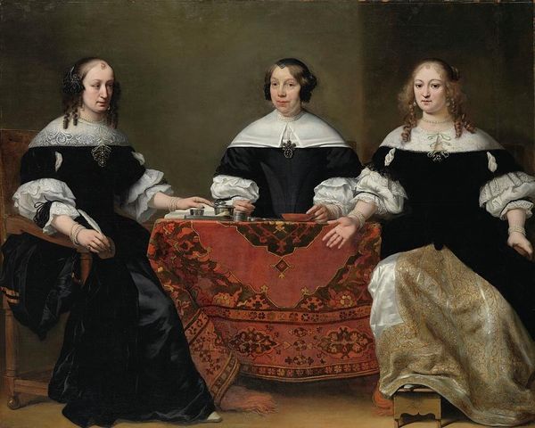Curator: Standing before us is Ferdinand Bol’s "Six Regents and the Beadle of the Nieuwe Zijds Institute for the Outdoor Relief of the Poor," an oil painting dating back to 1657, currently residing here at the Rijksmuseum. Editor: My immediate impression is one of subtle power. The muted palette focuses attention directly on the subjects' faces, creating an almost psychological tension. Curator: It's a fantastic example of a Dutch Golden Age group portrait. Bol captures these figures not as archetypes of charity, but as individuals responsible for a crucial social function. The dark clothing, the crisp white collars, speak to the somber dignity expected of their role. Editor: Exactly. And consider the formal arrangement—the figures grouped asymmetrically, anchored by that richly textured table. The restrained use of red draws the eye and suggests perhaps the emotional "heart" of their bureaucratic task. There is a document partially rolled and held firmly in the hand of the front figure, with his assured but unsmiling expression this lends a narrative thread to their assembly. Curator: Indeed. The symbols here speak of their shared responsibility. Notice the man on the left holding a staff; he is the Beadle, the officer ensuring order. And these books, documents, and quill pens stand for written, organized action – a world emerging from personal largesse into systematized giving. They convey concepts that we readily recognize today through entirely visual forms and color choices that reinforce a unified tone, it seems as natural and intuitive now as I suspect it must have done at its inception. Editor: The overall composition almost acts as a microcosm of society, neatly arranging social hierarchies for visual consumption. Even their hats seem to signify their position—each contributing to a complex semiotic interplay. Curator: And despite the inherent formality, Bol allows a touch of humanity. You can sense the subtle differences in character through their gaze and stance, these expressions offering us echoes of the lives they lead away from their philanthropic work. Editor: Well, analyzing Bol’s strategy of formal composition gives another, deeper reading of a traditional scene, helping us to uncover the cultural and personal nuances embedded in his canvas. Curator: It really illustrates how careful attention to both the concrete, and intangible can reveal the rich and deeply connected roots of cultural heritage.