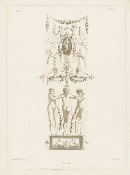 Editor: This etching, titled "Man en vrouw naast gevleugelde figuur" by Mathieu Lauweriks, dating back to 1895, presents a rather stark and mysterious scene. The figures feel so rigidly placed, and the winged figure… what's happening there? What do you make of it? Curator: Ah, Lauweriks! What a curious cat. I find myself drawn to the dance of geometric lines and symbolic forms that define this piece. There’s something undeniably esoteric and almost… architecturally spiritual about it, don’t you think? Almost like he is building up a mystical space, brick by brick! What’s your take on that, on how he seems to almost engineer a feeling? Editor: Architecturally spiritual... I like that! I see how the composition is very deliberate, almost like a blueprint. Do you think he was trying to communicate some kind of specific message, maybe tied to symbolism or the Art Nouveau movement? Curator: Absolutely! Lauweriks was deeply interested in theosophy, and this work screams symbolism! Think of the wings, for instance - they're less about literal flight, more about transcending earthly limitations, reaching towards some divine or higher state. Art Nouveau loved all this stuff too! It's about expressing an inner experience. Perhaps even the awkwardness that often comes with intense spiritual inquiry, what do you think? Editor: I suppose so! It definitely complicates the reading… almost mocking the otherworldliness? It is funny! But it also enhances it, creating tension. Curator: Precisely! And isn’t that delicious? The humor and solemnity tango together, reminding us that even in our loftiest aspirations, there's a little bit of the earthly clod clinging to our boots. Editor: That gives me a lot to think about… I will never see prints the same!