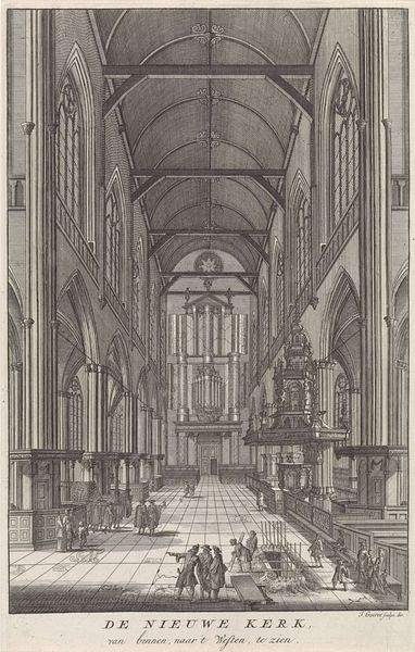 Curator: This drawing, crafted with ink, showcases "Interieur van Oude en Nieuwe Kerk te Amsterdam" by Johannes Hilverdink, circa 1844. It’s housed right here at the Rijksmuseum. What’s your initial impression? Editor: It feels vast and echoing, almost…clinical? Despite the architectural grandeur, the depiction seems detached, observed rather than experienced. There is a starkness to the lines and lack of warmth. Curator: It’s interesting you say “clinical." Hilverdink presents us with two distinct interior views in this print – The Old and New Churches of Amsterdam. In terms of reception, what were the social functions of depicting sacred spaces? Editor: Well, representations of religious institutions have historically served numerous ideological purposes, from reinforcing social hierarchies to legitimizing political power. Depictions like this would subtly reaffirm the Church's presence and influence within Amsterdam's evolving urban fabric. Considering the print medium itself, reproduction allowed broader circulation of a constructed public image. Curator: Precisely. The engraving technique employed democratized access to such images. But beyond structural power, how might the architecture and its representation reflect broader issues concerning gender, perhaps through access or exclusion? Editor: That's a critical lens to apply. While superficially egalitarian, these spaces historically limited women's agency, both physically and symbolically. Representations can reproduce those limitations, reinforcing the patriarchal narratives inscribed within the architecture. Hilverdink's depiction normalizes that structure; by portraying these grand spaces from particular perspectives, it’s almost framing an experience of access – which we need to read critically, given the social structures of that time. Curator: Absolutely. And given the Dutch Golden Age influences and burgeoning realism of the time, that tension between realistic depiction and ideological reinforcement becomes especially palpable, don't you think? Editor: Without a doubt. The artistic choices reflect not just observation, but also participation in constructing the church’s public identity and its impact. Hilverdink captured an aesthetic and also a cultural position. Curator: Ultimately, it highlights the intertwined nature of art, social history, and representational politics. Thank you. Editor: It enriches our understanding, seeing this art both in and outside its own time. Thank you.