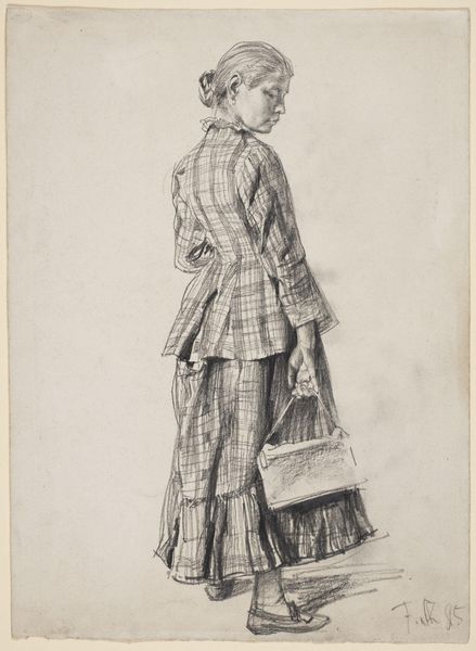 David Bles created this figure study of a standing man, using graphite and possibly charcoal, sometime in the 19th century. Bles lived and worked during a time of significant social and political change in the Netherlands, and was well known for his genre scenes and historical subjects, often depicting the lives of ordinary people. This sketch offers an interesting, intimate perspective on the male figure, with a focus on attire that signifies status and belonging. The man's posture and clothing reflect a certain level of formality, perhaps speaking to the societal expectations of men of his class. The hat tucked behind his back suggests a casualness that disrupts the formality. Bles was part of a broader European artistic movement which began to question traditional artistic approaches, creating a dialogue between the individual and society. The emotional tension in this simple, quickly made sketch comes from the mix of formality and vulnerability, challenging the viewer to consider the complex layers of identity and representation.