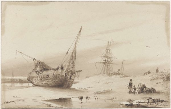 Curator: Ah, here we are in front of "Zeegezicht," a compelling 19th-century seascape created by Albertus van Beest, active during 1830 to 1860. It’s a study rendered in watercolor, very much en plein-air I think, currently held in the Rijksmuseum. What's grabbing you first? Editor: Okay, immediately it’s the muted tones, that hazy, dreamy feeling it gives off. Like a memory fading, or maybe a peaceful but slightly melancholy morning by the sea. What strikes you from a historical point of view? Curator: Given the timeframe, the prevalence of maritime themes in Dutch art, and van Beest's personal history, there's a complex dialogue occurring here. We can consider Romanticism’s interest in the sublimity of nature, while also thinking about the Netherlands’ reliance on maritime power, both commercially and militarily. How does that tension inform what we see, between nature and nation? Editor: Wow, yeah, suddenly the hazy dreaminess feels heavier. It’s not just gentle now, there's a sort of quiet assertion there too, this claiming of the water... Makes me think about what "freedom of the seas" even meant then, who had it, and who didn't. And there's that single figure in the small boat in the foreground, almost invisible against the sand… Curator: The solitary figure does create a visual and perhaps metaphorical counterpoint. Van Beest’s seascapes often romanticized naval exploits and marine commerce but showing him in a raw form of survival complicates those celebratory readings, doesn't it? Editor: Absolutely! So much of what gets glossed over is precisely those complicated elements. Even those birds feel pointed – are they hopeful, ominous? See, this is why I dig art, all that unspoken history! Curator: Indeed! And art offers us this very lens to reflect critically on those pasts while informing our presents. A beautiful example of history and perspective melding into something meaningful, don’t you agree? Editor: Definitely. I’m walking away seeing that tranquil seascape wasn't quite as tranquil as I first thought... Thanks for messing with my head in the best way!