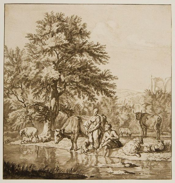 Curator: Here we have Rembrandt van Rijn's etching, "The Good Samaritan." Notice the intricate detailing, particularly the play of light and shadow achieved through varied line weights and cross-hatching. Editor: It feels almost like a stage set, doesn't it? That crumbling architecture in the background throws the foreground figures into such stark relief. Curator: Indeed, the composition guides the eye. Consider the central archway—a framing device emphasizing the narrative core. The lines direct us to the figures aiding the injured man. Editor: The light almost seems to emanate from the Samaritan himself, highlighting the kindness and compassion at the heart of the biblical tale. It is interesting to note the seated dog, a wonderful addition to the scene. Curator: His humanism, expressed through form and light, renders the parable timeless and relevant. Editor: Yes, it makes you ponder the meaning of compassion in our own world.