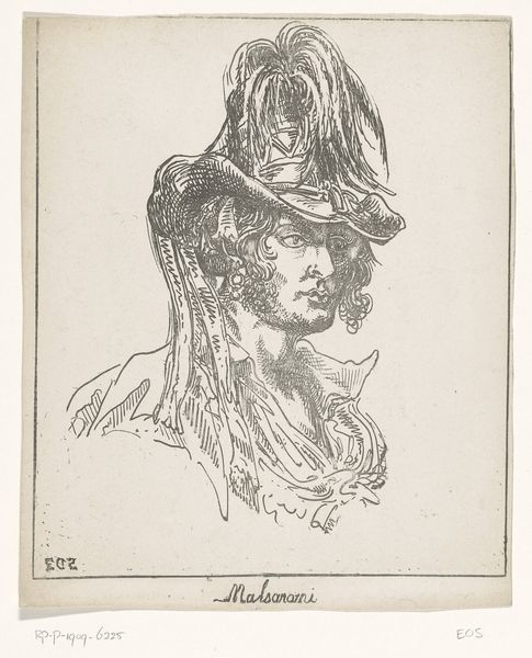 Editor: Here we have "Spansk bonde," a drawing from between 1878 and 1880. It appears to be made with pencil and ink. I am immediately struck by its raw, almost unfinished quality. What can you tell me about it? Curator: Notice first the paper itself. It’s clearly not high-end archival quality. The drawing, likely a quick sketch, utilizes readily available materials. Considering its creation during a period of increasing industrialization, we can see this work as a potential resistance to mass-produced imagery. How does the choice of materials impact its message, do you think? Editor: Well, the sketch-like quality, paired with everyday materials, makes the subject feel less like a grand portrait and more like an ordinary person captured in a moment. Perhaps it's elevating the working class, by representing laborers at eye level? Curator: Exactly! Consider the socio-political context. What’s happening with labor movements during that time in Spain and broader Europe? This drawing might subtly champion the dignity of the common worker through its very creation, its unfussy style contrasting with the polished portraits of the elite. What does the inscription at the bottom, "Valladolid, 17.Febr.78", tell you? Editor: That detail is very important – it pinpoints both place and time. That’s when and where this artwork was crafted. Thank you so much, the focus on materials really does change my perspective of this work. Curator: Indeed. Analyzing the means of production encourages us to view art not just as aesthetic objects, but also as cultural artifacts deeply embedded in social realities.