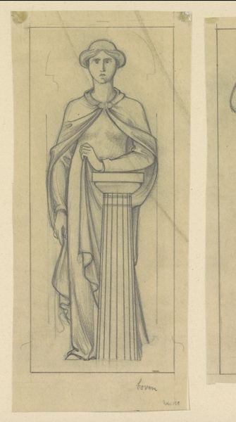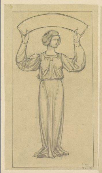 Curator: Oh, this is lovely! There's such a gentleness to this drawing. Editor: Agreed. The soft pencil work creates an almost ethereal effect. I’m immediately drawn to the figure’s placid expression. Tell me more about this work. Curator: Well, what we’re looking at here is a design by Antoon Derkinderen, dating between 1869 and 1925. It’s titled "Ontwerp voor wandschildering in de Beurs van Berlage: staande vrouw met banderol" - quite a mouthful, isn't it? In English, that translates to "Design for a mural in the Beurs van Berlage: standing woman with banner." Editor: Ah, context is key. So it was intended as part of a larger scheme. I can imagine this figure fitting in quite well with the Berlage’s overall architectural ambitions—that fusion of socialist ideals and early modernism. Curator: Absolutely. To me, it feels like she's caught between worlds, a little melancholy perhaps? I wonder what the banner was supposed to proclaim. A vision of the future, maybe? Editor: Or perhaps a remembrance of the past? Her dress has a decidedly classical, almost Grecian feel, doesn’t it? It strikes me that the banderol she holds could also represent an unspoken claim. It's as if she is literally and figuratively carrying this weight. Her figure almost takes on the appearance of the Atlas, from Greek Mythology. Curator: Interesting parallel. But isn't there a quiet strength there too? Even with the downward cast of her eyes, there’s a resilience I feel. It might be how solid her feet are planted, her robe falling to the floor as the foundation. She grounds herself and her potential statement. Editor: I agree about the sense of groundedness you picked up on. Thinking about her role as a mural figure, she likely would have had to visually express qualities associated with that particular space. She's bearing the figurative and literal weight of the message. Curator: A wonderful example of how art doesn’t need to shout to be heard. I can just feel so much potential contained within those quiet lines. Editor: Precisely. It's a study, a preparation – yet brimming with potent symbolism and quietly complex undertones related to her posture as bearer of meaning.