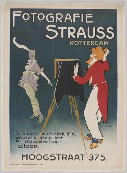This striking poster, made by Arnold van Roessel, advertises shows at the Cabaret Artistique in Scheveningen. It's made by the lithographic process, a key form of mass media in the early 20th century. The process of lithography involves drawing an image with a greasy substance onto a stone or metal plate, treating it with chemicals, and then using ink to print multiple copies. The strong blocks of color and bold typography, typical of posters from this era, grab the viewer's attention, promising an evening of entertainment. You see the names of the performers and the titles of the acts, all carefully arranged for maximum impact. What's interesting is how this poster reflects the burgeoning entertainment industry. It presents art as a commodity, something to be consumed by the public. The poster itself becomes a piece of that commercial machinery. The very act of making and distributing these posters contributes to a culture of mass production, a very different context from the hand-painted artworks you might see in a gallery.
