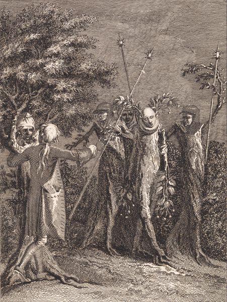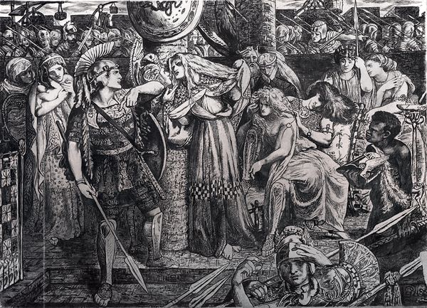 Curator: "The Knight's Farewell" by Edward Burne-Jones, created in 1858, immediately evokes a somber, almost resigned feeling. The monochrome pencil work seems to deepen that sentiment. Editor: Indeed. The figures are strikingly posed, and the detail achieved through pencil alone is remarkable, isn't it? Observe how Burne-Jones manipulates light and shadow to create such a defined scene. Curator: From a contextual lens, think about Victorian society, steeped in romantic ideals and Pre-Raphaelite sensibilities. This drawing speaks volumes about gendered expectations and the roles assigned to men and women, especially during times of conflict. Notice the female figure seemingly bound to this space as the male figure goes off to war. Editor: The formal positioning emphasizes that division; consider the angles and implied lines. She is rooted, with long lines throughout her clothing directing your view vertically from earth to sky, while he's crouched down and appears poised for movement—much more horizontal than vertical elements used throughout his design. Curator: Exactly. There's a stillness about her, perhaps a visual representation of the domestic sphere, contrasted with his duty. War then is not merely about battlefields but profoundly shapes the personal dynamics between men and women. Editor: And this composition lends itself so nicely to exploring binary oppositions in Victorian culture! It allows us to really engage and scrutinize how such gender roles are aesthetically manifested. Curator: It is fascinating how the choice of medium supports that narrative. Pencil allows Burne-Jones to convey the texture and richness of their garments as well as convey the fine emotive lines on their faces in the grayscale tone that communicates the overall grief, while being portable as a sketching tool itself may refer to a memory from war or travel itself. Editor: Yes, the narrative here becomes about more than just war; it transforms into an intimate glimpse into relationships strained under societal pressures. A silent dialogue where expectations are visibly laid bare through subtle artistic choices. Curator: Reflecting upon the narrative’s constraints highlights the pervasive pressures that have historically defined human lives. Thank you for offering that critical perspective, providing richer insight to Burne-Jones’ somber drawing. Editor: It's an important discussion because beyond technique, it allows us to grapple with the socio-historical context, broadening our appreciation for this Victorian-era creation.