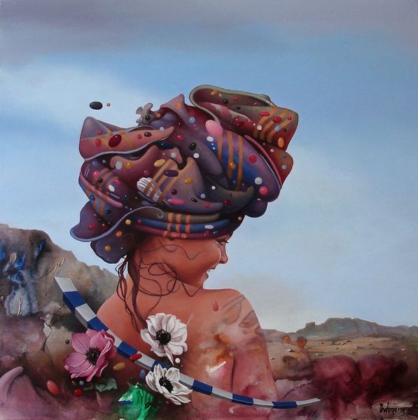 Editor: Here we have “Magnet,” an acrylic on canvas painted in 2012 by Dragan Ilić Di Vogo. It’s definitely striking—this nude figure perched on what looks like a dreamscape rock formation. It’s giving me a slightly melancholic vibe, but also a feeling of…potential? What pulls you into this piece? Curator: Melancholy, yes, I feel that too. But “Magnet,” for me, is about that magnetic pull of creativity itself. Look at her; she's perched, exposed, vulnerable, but utterly confident in her own space. The surreal objects scattered around aren't just decoration, are they? Editor: No, they seem to suggest something, but I can’t put my finger on it. Like that flower and the dice cube...and is that an egg? Curator: Exactly! They’re talismans, symbols—think the bloom of an idea, the calculated risk, the potential for birth, and new beginnings. I like to think the landscape itself is the interior of the creative mind. The way it kind of weeps colour—is she drawing this up herself? Or from us, the observer? Editor: Ooh, I like that perspective! It makes the title feel more…active, less passive. Like, she isn’t just *being* magnetic; she’s generating that force. Curator: And aren't we all magnets in our own right? Drawing, repelling. It is fascinating how he sets up a space where reality meets the symbolic so seamlessly, like waking up to a surreal, unexpected thought. It just *is*, suddenly. Editor: I never really thought of it that way, but now, seeing the landscape as a mindscape…it completely shifts how I read the whole painting. Curator: It’s funny how art does that, isn't it? Lets us magnetize our own meanings!