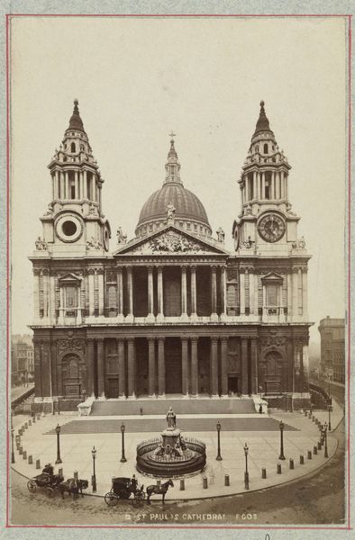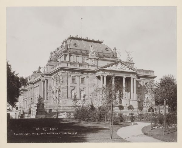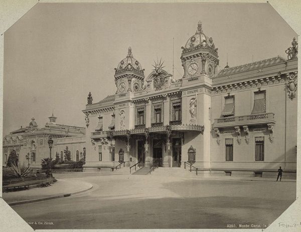 Editor: Here we have *Exterieur van het theater van Monte-Carlo*, taken sometime between 1890 and 1900 by Photoglob & Co. It’s a photograph showcasing the theatre's façade. The composition feels very formal, almost staged. What social and historical context can we attribute to this work? Curator: That formality speaks volumes. It’s not just a building; it's a monument to societal ideals of the time. Neoclassicism, so evident in the architecture, was often embraced by the ruling classes. Think about what this theater represented: entertainment, leisure, but also a very specific type of leisure accessible only to the wealthy elite. Who was allowed in those doors, and what kind of performances were deemed worthy? Editor: So, the architecture isn't just aesthetic; it's making a statement. How does photography play into this? Curator: Photography itself was evolving then. The ability to capture and disseminate images of grand architecture helped solidify those power structures. Images like these helped promote the ideals of empire, wealth, and cultural superiority. Who benefitted from this visual representation, and whose stories were left out of the frame? It's all about carefully constructed narratives, even back then. Editor: It's interesting to consider how the photograph, like the building, performs a kind of social gatekeeping. Now I wonder what exists behind the façade, both literally, and metaphorically. Curator: Exactly! Consider the spaces and stories not readily visible. How does this image contribute to larger, sometimes skewed, historical records and understandings? That's where the real work of interpretation begins. Editor: That’s a powerful way to think about it; looking beyond the immediate image and understanding its role in shaping broader narratives. Curator: Indeed, by engaging critically with such images, we start unearthing hidden layers of power, identity, and representation.