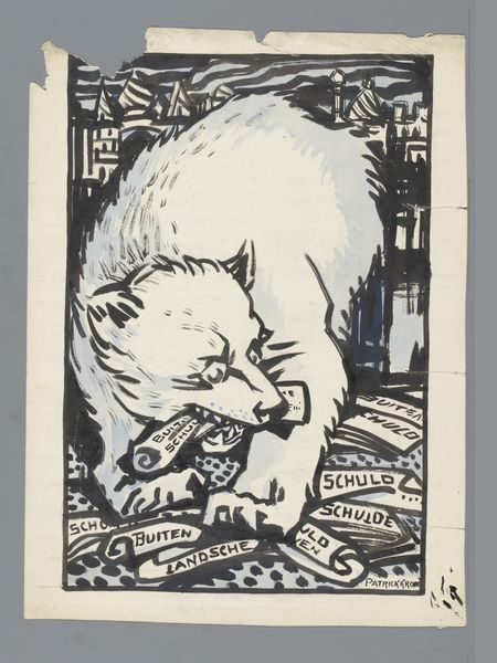 Henri van der Stok created this print, *Sterrenbeeld leeuw,* using a woodcut technique. The stark contrast between black and white captures the powerful image of Leo the lion, along with celestial elements. Woodcut is a relief printing process. The artist carves away at a block of wood, leaving a raised design. When inked, only the raised areas print, resulting in bold, graphic images. Van der Stok's precise carving is evident in the lion's mane and musculature, achieving a striking level of detail. The labor-intensive nature of woodcut printing speaks to the value placed on craftsmanship during the early 20th century. Compared to industrial printing methods, each print carries the mark of the artist's hand. The medium's inherent qualities – its texture, the way ink sits on the surface – all contribute to the artwork's visual impact. Considering the material and process allows us to appreciate the artist's skill. It also challenges the traditional hierarchy between fine art and craft, as printmaking relies on both artistic vision and technical expertise.