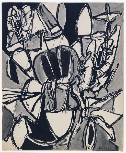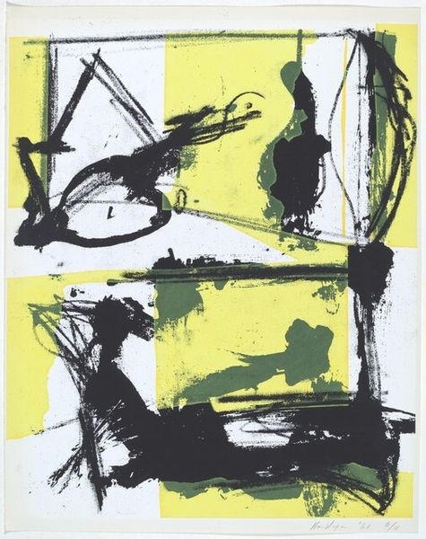 This untitled print by Samuel Buri presents a study in abstract forms, dominated by the bold use of color. Notice how the deep blues and vibrant yellows create a visual tension, guiding your eye across the composition, and evoking a profound sense of the primordial chaos of the universe. The symbolic interplay of light and dark has been a recurring theme throughout art history. Think of the Renaissance masters, where chiaroscuro was not merely a technique, but a tool to explore psychological depth. Similarly, the simplified shapes here remind us of ancient ideograms, hinting at universal concepts through symbolic reduction. Consider, too, the raw, expressive brushwork. It echoes the dynamism found in the works of the Expressionists, where emotional intensity trumps literal representation. This primal symbolism suggests the cyclical nature of artistic expression. What surfaces here is a reminder that our artistic ancestors' search for meaning continues to resonate.