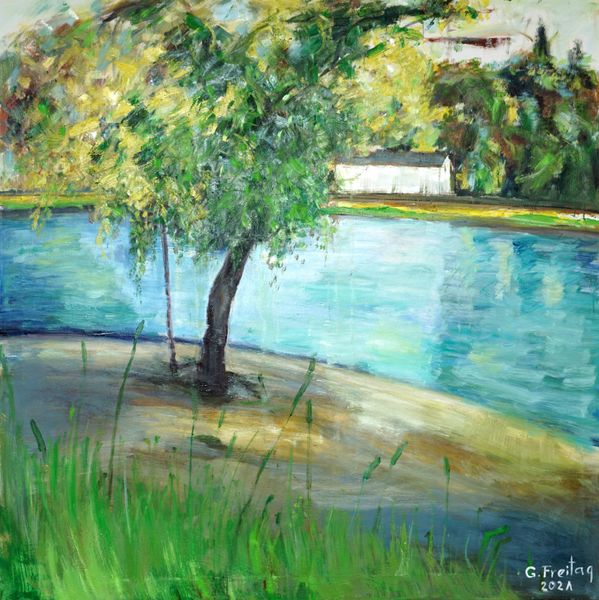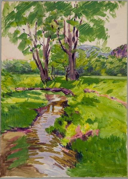 John Singer Sargent painted this riverside scene near Oxford using oil paints. The quick, expressive brushstrokes are immediately apparent, giving the work a sense of spontaneity. But consider too the very nature of oil paint itself. Ground pigments suspended in oil, a slow-drying medium that allows for blending and layering. Sargent wields this material with confidence, building up the image through a series of energetic marks. You can almost see him mixing the colors right on the canvas, capturing the fleeting effects of light and atmosphere. This direct approach to painting, very popular at the time, emphasized the artist's hand and the materiality of the paint, and it moved painting away from the highly finished academic style of earlier generations. Sargent’s work exemplifies the shift towards a more modern sensibility, where the process of making becomes an integral part of the artwork's meaning.