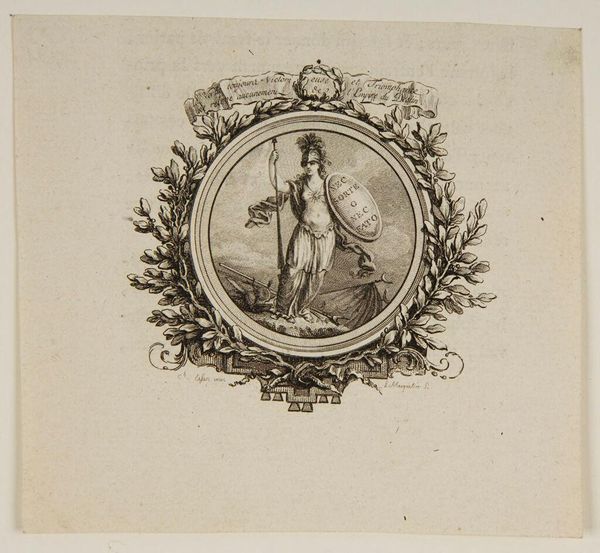 Curator: This is an illustration by Joseph de Longueil. It is undated but we know de Longueil lived from 1730 to 1792. Editor: There's such fragility to it, yet it feels very deliberately constructed with the surrounding wreath and ornamentation. Curator: Right, illustrations like this were often part of larger texts, adding a layer of visual interpretation to written narratives. The engraving process itself, the labor, the printing—all speak to broader systems of knowledge production. Editor: It does make you think about the story being told. What are these figures enacting? And what does it mean to frame them so elaborately? Curator: I think de Longueil, and others, saw these illustrations as essential to shaping public understanding and reinforcing certain social values. Editor: I see a story aching to be told, nestled in a frame, almost like a dream trying to peek through reality. Curator: It's fascinating how art can serve both to reveal and conceal. Editor: Indeed. We find ourselves pulled into a story, but are left to wonder about what’s left unsaid.