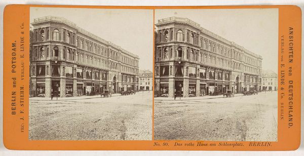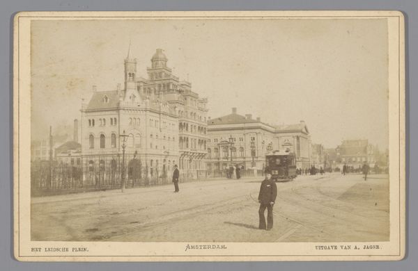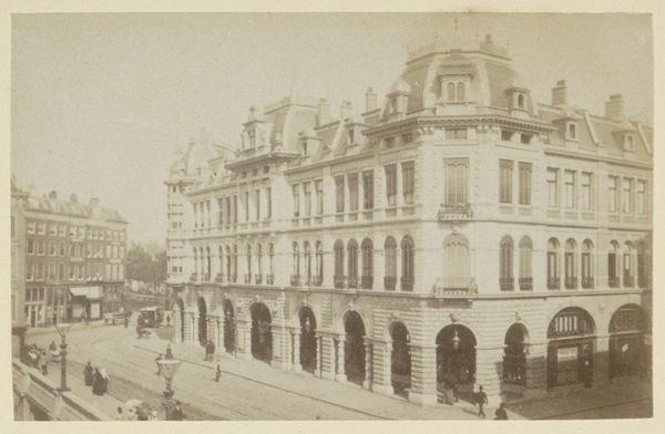 Curator: This piece is a photographic print by Carl Haack, entitled "Gezicht op de Opernring te Wenen, Oostenrijk," dating from 1870 to 1880. It beautifully captures a streetscape of Vienna. Editor: The first thing that strikes me is how wonderfully faded and dreamlike it is! It gives off such an ethereal, ghostly aura, like looking at a city through memory. Curator: Exactly. Think about the material conditions in which this image was created. The laborious photographic processes of the late 19th century involved coating glass plates with light-sensitive emulsions, careful development in darkrooms...it all contributed to the distinct visual characteristics we observe. Editor: And that deliberate process shines through, it's romantic. It’s also intriguing to think of the sheer effort involved compared to taking a quick snap today, wouldn't you say? Curator: The photograph acts almost like a time capsule, showcasing not just the architecture but also the social and technological context. We see evidence of industrial advancement through the architecture and urbanization reshaping Vienna and its surrounding landscapes. How the consumption of photographic images changed social behaviors is what holds me captive. Editor: You're absolutely right. The rigid buildings emphasize that. Although, look, in its own way the framing and muted sepia tones make it a very tender observation too! So, Carl Haack managed to capture a piece of the old within this burgeoning metropolis! Curator: His composition invites you to consider what went into constructing that visual world - urban planning, labor conditions in manufacturing, the rise of photography as a commercial art form. All of that impacts what we're seeing here. Editor: Thinking about those contrasts, you’re so right. Well, all this talk of industry and technique really does bring a lot of layers into appreciating this piece of historical craftsmanship! Curator: It adds a richness that’s undeniably interesting. It encourages you to appreciate not just what is shown, but how and why. Editor: Thank you so much for pointing all this out! It seems, that by simply reflecting a single frame in a street in old Wien we end up pondering not only what we see, but all it entails. What an invitation!