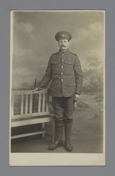 This photograph, made by The Art Photo Co., presents an unknown man in uniform. What immediately strikes us is the carefully structured composition, an almost geometrical arrangement of forms. The subject is positioned centrally, his figure mirroring the vertical lines of the faux stone balustrade. The muted palette, almost monochromatic, gives the photograph a sense of timelessness. Notice how the textures—the smooth surface of the balustrade, the coarse fabric of the uniform—play against each other, creating a subtle visual rhythm. The figure's gaze, directed slightly off-center, introduces a dynamic tension, disrupting the otherwise rigid symmetry. But what does this calculated arrangement signify? The photograph isn't merely a record; it's a construction. The backdrop, the pose, the uniform, all speak to a desire for order and control. The photograph becomes a stage upon which identity is performed, and the individual subsumed into the collective. Yet, in its very artifice, the image reveals the constructed nature of identity itself.