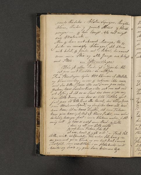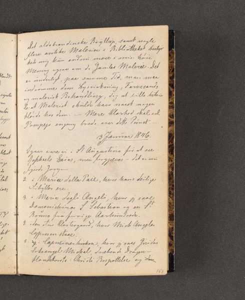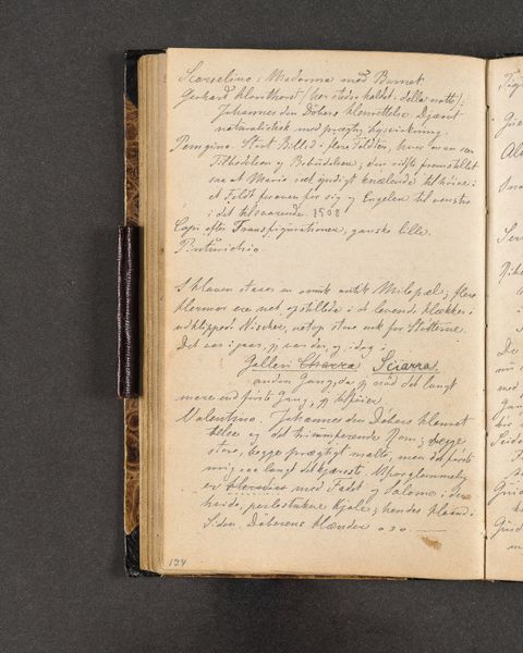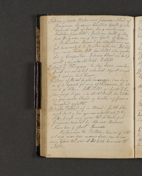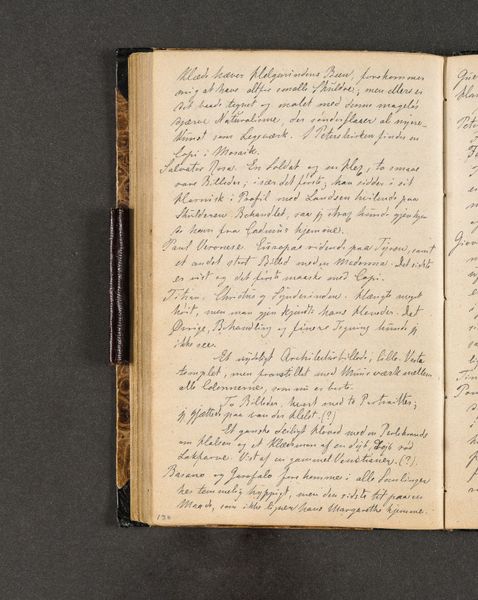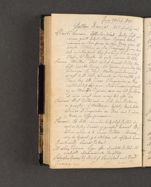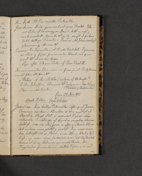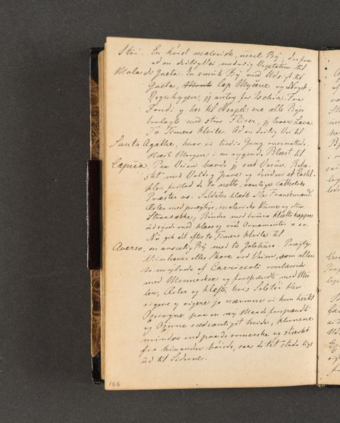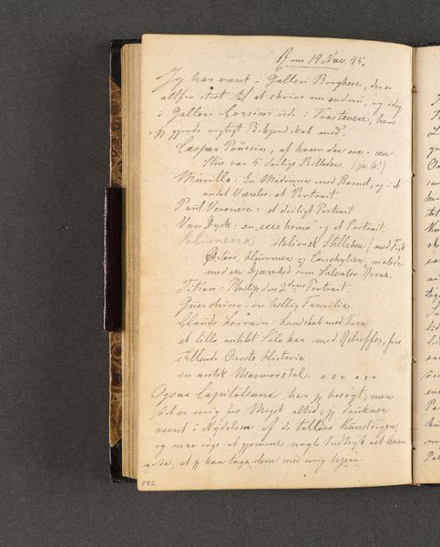 Curator: Here, we see a page from Johan Thomas Lundbye's "Rejsedagbog" or Travel Journal, dating back to 1845. It is a drawing, a notation really, rendered on paper. My initial response involves wondering about the story behind this object's creation: its production, access to materials, and the very labor embedded within it. What strikes you about this piece? Editor: I think I am struck by the text, but without understanding it, I am somewhat disconnected from the work itself. And the brown smudges, of course. What story does that element bring to the art making itself? Curator: I think Lundbye's journal entries offer us a glimpse into his material world and artistic process, right? Consider the accessibility of paper and ink at that time, versus now. And the portability of the sketchbook form itself. Did this constrain or enable the work, the notes here regarding travel observations, perhaps of landscapes and art he encountered, not simply high art, but observations. Editor: I never thought about how the availability of materials affects an artist’s choices. So, knowing this was part of a travel journal, does the writing have a significant meaning for you? Is the artistic creation or notation an act in itself? Curator: Indeed, understanding that Lundbye actively *chose* to record his experiences using accessible materials, rather than monumental canvases of the Salon, redefines our interpretation, doesn't it? His immediate responses carry meaning in and of themselves. They circumvent high art to become about simple process. Do you find that adds another layer to our viewing experience? Editor: Definitely. Recognizing the social and economic conditions, how a simple sketchbook acted as a space for artistic documentation… It makes me think about the many artistic processes beyond finished masterpieces. Thank you! Curator: My pleasure! The materials and means really do help uncover broader, deeper insights.