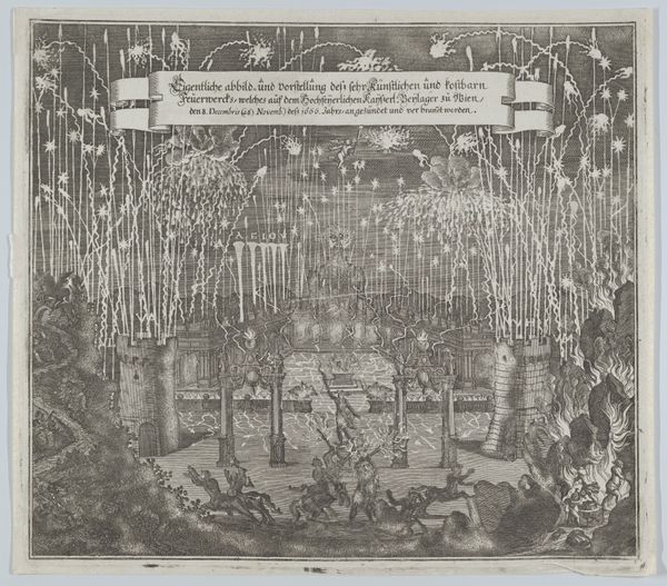 Editor: This engraving, "Illuminationen på Frijsenborg" from 1749 by Poul Isac Grønvold, captures what seems like a grand celebration, maybe even a royal spectacle. The fireworks, though rendered in black and white, suggest intense light and movement. I'm really drawn to the stark contrasts, the way the light cuts through the darkness. What stands out to you, observing it from a formalist perspective? Curator: Certainly. One cannot ignore the sophisticated use of line. Observe how Grønvold employs hatching and cross-hatching, varying the density to depict not just light and shadow, but also to define the forms within the landscape. Note also, the visual organization is resolutely symmetrical; the bridge acts as a central axis, creating a mirroring effect that lends a sense of order to what could have easily become a chaotic composition. Are you perceiving that same, deliberate formalism in the design? Editor: I do, but wouldn't that symmetry also point to the hierarchical structure of the event, reflecting the power of the royal family or the patron? Curator: It's possible. However, I'm less concerned with speculation about intended symbolism and more with appreciating the sophisticated arrangement of line, form and the considered contrast between light and dark, creating depth and directing the eye. The technical mastery itself becomes the subject. What effect does the monochromatic palette have on your interpretation? Editor: I guess I focused on what was represented—the event itself—and less on the effect of the colour limitations. Actually, I suppose the limited tonal range simplifies the scene, making the lines and forms all the more important, like you were saying. I never would have looked at it this way, if it wasn't for this formalist lens. Curator: Precisely. Shifting your gaze to the intrinsic elements will enhance your understanding.