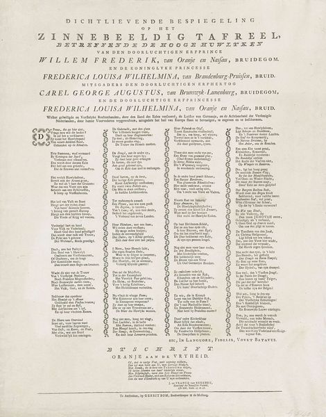Curator: What strikes me immediately is the visual density of this print. The composition feels very deliberate in its layering of image and text. Editor: Indeed. This is a New Year's wish from the Amsterdam newspaper carriers for 1832. It’s an engraving on paper. Anonymously created, it showcases a blend of text and small vignettes. Curator: The textual elements take up so much of the overall space, nearly obscuring the pictorial details. Is this purely functional or might the visual rhythm it creates be aesthetically deliberate? Editor: Function definitely plays a huge part. Think of these New Year's prints as a kind of promotional material, almost like elaborate business cards, aiming to ingratiate the carriers with their clientele for the coming year. Curator: So, form follows function here. The three vignettes across the top establish the importance of landscape through careful visual composition and organization. I find my eye bouncing between them, looking at the play of dark and light, and how they contribute to the overall dynamic. Editor: Certainly. Look at the central vignette, the cityscape framed by leafy ornamentation—a classical nod, setting off a depiction of Amsterdam. To its sides are maritime scenes, probably symbolizing Amsterdam's mercantile power. All rendered in delicate engraving. Curator: And notice how these are rendered; the ship and cityscape feel dreamlike or sentimental. The tonal variations are masterfully handled to create a subtle sense of depth. It creates a powerful emotional undercurrent for what otherwise could have been a standard announcement. Editor: Absolutely, the print also reflects broader cultural themes and urban developments, highlighting Amsterdam’s social hierarchy during that period. A document that tells us so much about a very particular moment in the city’s history. Curator: So, ultimately we find harmony in the relationship between practical needs and artistic expression; form serving function, and function allowing the artists to achieve real grace. Editor: And perhaps by understanding that intricate dance we better appreciate the multifaceted role this played for the people of Amsterdam nearly two centuries ago.