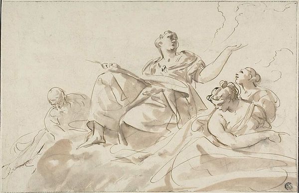 Editor: Here we have Gian Antonio Burrini's "Woman and Putti in the Clouds," created between 1685 and 1689 using ink on paper. The light and shadow create such depth, but it feels preliminary. What is your take on this ink drawing? Curator: The linearity predominates; observe how the figures emerge from the cloud forms primarily through the artist's manipulation of line. The academic approach to rendering musculature, the drapery—all achieved through line—is quite pronounced. Note the contrast between the delicate hatching used to model the woman's form and the bolder, more graphic lines defining the putti. Editor: So, it’s more about the line work than the subject itself? Curator: The subject serves as a vehicle. It's the artist's treatment of form that compels our attention. Consider the implied volumes, the sense of three-dimensionality achieved through purely graphic means. The tonal gradations, despite their subtlety, suggest a sophisticated understanding of light and shadow. Where does the emphasis fall for you? Editor: I suppose I was initially drawn to the dynamism – the billowing cloth and the figures in motion, which seemed to indicate drama in the clouds, but your description directs me toward the more deliberate aspects of Burrini's technique, almost like a study in line and shading. Curator: Precisely. It’s a rigorous exploration of form, rather than a narrative tableau. A reduction to the elements themselves is the basis for how we should see the organization of space. The baroque influence shows how grand the form can be when presented from an elevated point. Editor: It definitely shifts my focus. I was too quick to look for the story. It is more compelling to see what can be made from light and lines alone. Curator: Indeed, the artist's conscious articulation of line becomes the defining characteristic, inviting us to consider the inherent qualities of the medium.
