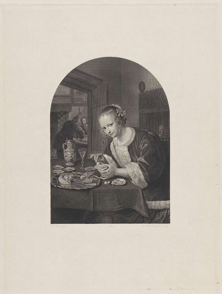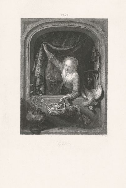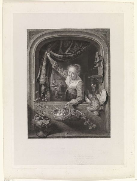 This is "Woman with fruit basket in window", a work by Willem Steelink II, created in the Netherlands. Steelink lived through a period of significant social change. This etching offers us a glimpse into the domestic sphere, reflecting the values and gender roles prevalent in Dutch society. We see a woman framed in an arched window with a basket full of fruit. Is she selling this produce or is the fruit for home consumption? Her direct gaze, combined with the curtain she’s lifting, feels like an invitation into her world. In the background there’s a scene of domesticity – women and children gathered in what looks to be a cozy interior. Steelink offers us a layered perspective on women’s roles. The presence of a dead bird hanging next to her is also intriguing. Is it merely an element of still life, or does it symbolize something about the woman’s own constrained existence within the domestic sphere? This work, through its intimate portrayal, encourages us to reflect on the everyday lives and unspoken stories of women in the late 19th century.