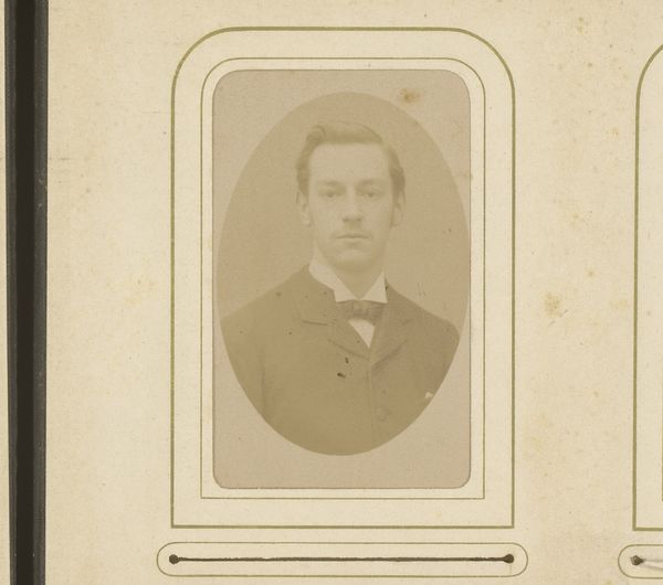 Curator: Here we see "Portret van een jonge man", a photographic work made sometime between 1882 and 1885 by Nicolaas Johannes Rinner. Editor: My first impression is of faded formality, the somber tones contributing to a subdued but dignified mood. Curator: I am drawn to the albumen print. This would have been a highly skilled artisanal craft, from the preparing of the glass plate to the mix of egg whites and chemicals needed to bring this young man to life, offering us a fascinating glimpse into the technologies and practices that defined photographic portraiture of that period. Editor: Note his formal attire; it projects an aura of nascent respectability. The slightly unfocused gaze gives me a feeling of contemplation, or perhaps slight uncertainty. Does it hint at dreams, maybe unrealized aspirations? Curator: Perhaps the formal trappings mask something else: the constraints placed on photographic production at this time. A formal studio portrait, I’m afraid. Editor: I see what you mean. Still, those soft, sepia tones whisper of a past world and personal stories, preserved in silver and light. A world struggling to be modern and finding it difficult. Curator: Exactly. Consider the material reality here: silver compounds, meticulously processed on paper, resulting in a commodified likeness, displayed on the mantelpiece to show their aspirations in life. How would he afford it? Was this part of a collection displayed at his future wife’s place? So many possible interpretations when we look through the lens of social practice. Editor: A captivating tension between surface representation and underlying realities then! We must always bear in mind the powerful iconography and the social framework to which this image speaks. Thank you, an elegant examination! Curator: The pleasure was all mine. Understanding the techniques, materiality, and societal conditions in which this photographic image came to life makes you wonder who the audience was for the photo and for what reason. I appreciate that point so much!