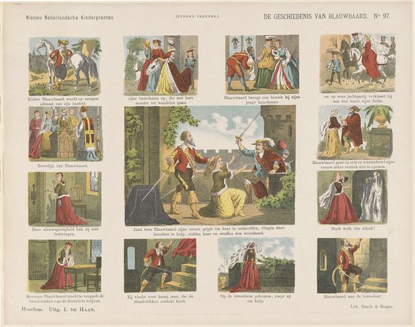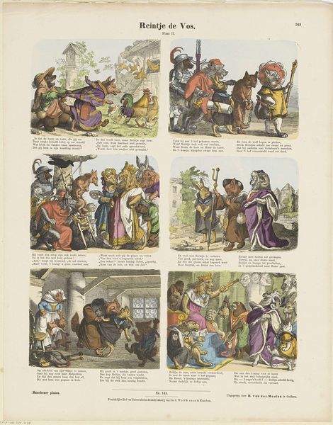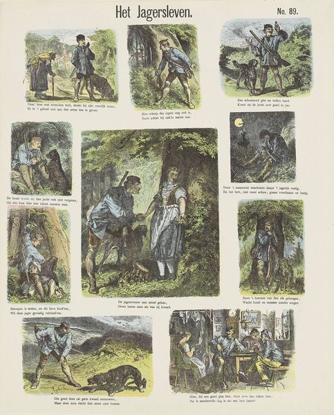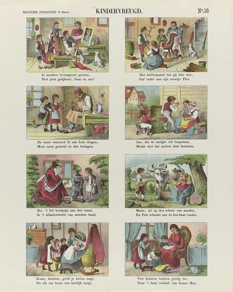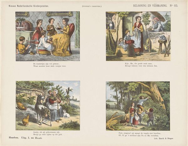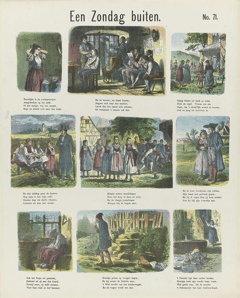 Curator: What strikes me immediately about "Uit den Kindertijd," a watercolor print dating to 1874 by De Ruyter & Meijer, is its simultaneous charm and melancholy. Six vignettes, like scenes from a children's storybook, are presented on a single page. Editor: It is a romanticized vision of childhood, indeed. And placing it in its specific era allows us to examine the prevalent social attitudes and values of the time toward children. Looking at it now, what do those representations reveal? Each image contains social commentary embedded in everyday scenes, potentially speaking to power dynamics in relationships, gender roles, and perhaps class differences within these intimate and familial contexts. Curator: Certainly. Consider the image in the upper left, depicting the arrival of Sinterklaas. The details – a stern adult, wide-eyed children, symbolic items like the broom – offer multiple layers of meaning tied to tradition and the anticipation surrounding the holiday. The artists are playing with very well-known signs. Editor: The recurring motif of play, appearing throughout the other vignettes depicting games and outdoor activities, acts as a mirror to broader social frameworks governing children's behavior. How do they behave amongst themselves? Where does one recognize childhood rituals and celebrations? Each scene invites viewers to contemplate how norms and beliefs influenced the experiences and shaped the very identities of these young subjects. Even the act of gathering wood, as shown in "De Sprokkelaars", hints at an intersection between work and play. Curator: The print’s format as a reproducible image makes its social impact potentially wide-reaching. And in viewing such an art object today, it serves as an intriguing point for discussion – connecting the depiction of childhood as perceived back then and the societal expectations we've come to place on it in contemporary life. Editor: Agreed. It sparks dialogues about the evolution of those perceptions of childhood. Looking at "Uit den Kindertijd", there's a blend of innocence, play, and a hint of the adult world pressing in. It offers a rich study on continuity and the ongoing reinterpretation of how we've related to visual representation and cultural expectations over time.