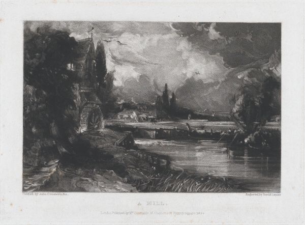 Curator: Here we have "Landschap met onweer", or "Landscape with thunderstorm", an engraving dating roughly from 1792 to 1834, by Lambertus Antonius Claessens. Editor: Wow, talk about moody. The whole scene is bathed in this dramatic chiaroscuro. I feel a sense of impending doom, honestly, like the air is thick with anticipation. Curator: The medium really enhances that, doesn't it? The intricate lines and textures created through the engraving process, mimicking the way light scatters in the storm. The labour involved to reproduce and distribute this scene also highlights an expanding middle class consuming these landscape scenes. Editor: Absolutely. You can almost hear the distant rumble of thunder. What strikes me is the juxtaposition. The humble figures in the boat almost resigned to their fate alongside the architectural boldness of the church or tower nearby. It makes me wonder, were there personal upheavals Claessens translated through the drama of this piece? Curator: It's quite evocative. Claessens's strategic deployment of light is key. The contrast he manufactures with his tools speaks to Romanticism's fixation on emotional states and its reaction to industrialized spaces, or its influence even outside painting, within engraving. Editor: Exactly! It's nature as a spectacle, a force both beautiful and terrifying, isn't it? Do you see, beyond this drama, hints of serene resignation of our part within natural cycles, where the little scenes of everyday life happen undisturbed despite it all? Curator: The enduring appeal of that contrast! Claessens captures a sense of tension, one perhaps symptomatic of the economic disruptions felt at the time among certain groups with traditional relations to the land. These materials also speak to a burgeoning industry eager to capitalize on these emotions! Editor: True. What stays with me, though, is the scene bathed in pre-thunder clarity... the boat still floating on serene waters beneath brewing chaos. So life affirming, right? It hints that this impending tempest perhaps gives clarity on life, and purpose too. Curator: A fitting reminder of Romanticism's complex dialogue with changing realities through landscape... Editor: Indeed. A journey into feeling itself—thanks for the tour.