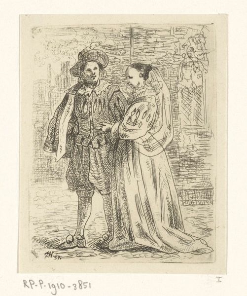 Editor: We’re looking at Jozef Hoevenaar’s "Paar in zeventiende eeuws kostuum," created in 1857. It's an engraving, giving it this really delicate, linear feel. What strikes me is the artist's apparent nostalgia for the 17th century; what can you tell us about it? Curator: You’ve keenly observed the artist's temporal displacement. In the 19th century, historical themes experienced a huge resurgence. This wasn't just about pretty costumes; it was about invoking certain societal values associated with those past eras. Editor: Like what kind of values? Curator: Often, a longing for stability, order, and a simpler life compared to the rapidly industrializing 19th century. Consider how this image might function within the broader political climate of the Netherlands at the time. Who would have been buying these prints, and what messages were they consuming? Editor: So, the clothing is not just decorative but carries symbolic weight, connecting viewers to an imagined idealized past. It's like a visual argument. Curator: Precisely. And that’s where it gets interesting. Were these images used to bolster a specific national identity? What narratives about Dutch history were being promoted, and perhaps more importantly, which were being left out? It's crucial to understand art not as isolated creations, but as active participants in societal discourse. Editor: It makes you think about how history is curated, not just represented. This work has made me consider that we must look beyond the surface appearance of artworks to discern the intentions and political implications that are deeply woven into the design. Curator: Yes! I hope it offers you, and the audience, a new understanding of this work.