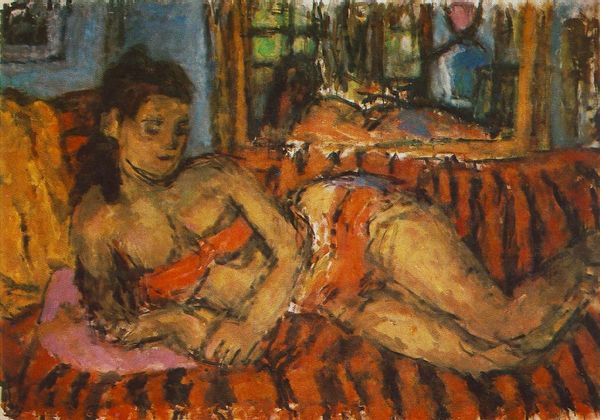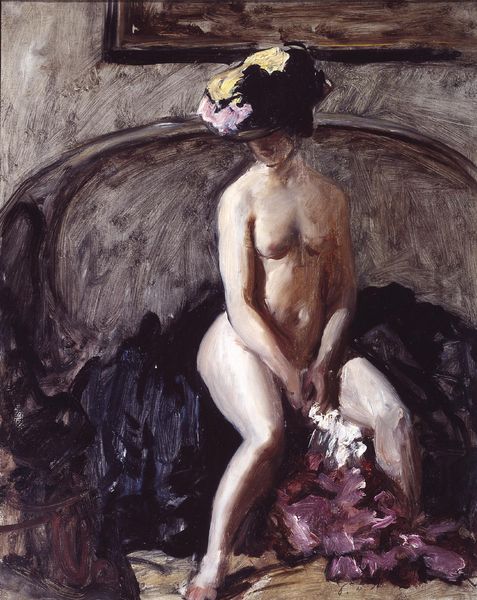 Editor: So, this is Henri Lebasque’s "Nu Assis," painted in 1936, using oil on canvas. There's a gentle, almost domestic feel to it. How do you interpret this work, especially given its historical context? Curator: That intimacy you sensed is key. Lebasque positions this nude not as an object, but within a space suggesting private contemplation. Consider 1936 – a world bracing for war. Does this intimate portrayal of the female form represent a retreat from or a subtle defiance against, the rising tides of fascism and its control over women's bodies? Editor: A defiance, maybe? I hadn't considered that. It's not overtly political, though. Curator: Exactly, its power lies in the subtle subversion. Instead of the idealized or eroticized nudes that dominated much of art history, here we see a woman simply *being*. She's not posed for the male gaze in the same way as more traditional nude paintings. The lack of overt sexuality feels significant. Do you think that adds to its quiet resistance? Editor: I do. It challenges the expected narrative. And thinking about Intimism, that makes sense, it’s not necessarily meant to be titillating or performative, but maybe something more mundane, which might have its own subversive charge. Curator: Precisely. Mundane can be revolutionary, particularly for women’s representation in art. By stripping away the performativity you mentioned, Lebasque potentially allows for a reading that emphasizes the woman's agency. What is her story in this moment, regardless of outside viewers and critics? Editor: I’m struck by how considering the sociopolitical climate deepens my appreciation for the work. It goes beyond the purely aesthetic. Curator: And that's the beautiful potential of art history – to see artworks as active participants in shaping, reflecting, and sometimes quietly resisting the world around them. Thank you, I see things differently now too!