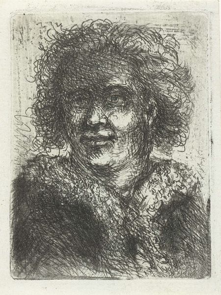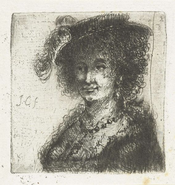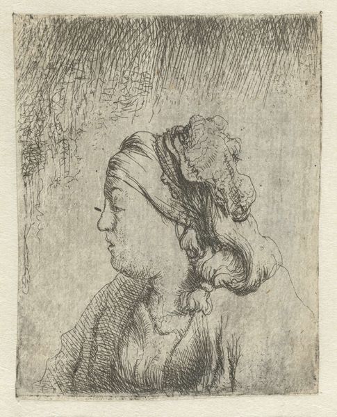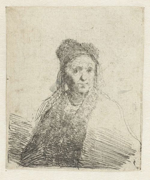 Editor: This is "Jonge Vrouw," or "Young Woman," an etching by Jan Chalon, made sometime between 1748 and 1795. It strikes me as quite an intimate portrait, almost like a quick sketch. What are your thoughts, particularly on the composition? Curator: The etching's power lies in its manipulation of line. Note the artist's attention to varied strokes. The concentration of dark, densely etched lines to the upper left which fades as our focus reaches the subjects face and gaze. How would you describe this variation? Editor: It feels almost… chaotic? Like the artist was building up form through pure texture rather than defined lines. I notice how the headdress has the tightest lines of the entire composition. Curator: Precisely. This tension—or perhaps synergy—between chaos and order, form and abstraction, is central to its appeal. Observe also how the cross-hatching gives depth to the shawl versus the background washes behind her head. Do you notice the slight inconsistency with how some lines appear? Editor: Yes, especially around the shoulders and background. It’s not perfectly smooth, giving it an almost unfinished feel, especially versus the fine detailing on her face and adornments. Is that contrast intentional? Curator: Most certainly. This visual texture introduces a dynamic element and what appears incomplete makes the subject seem present, alive. What are the key formal aspects that lend the portrait its enduring appeal, separate from, say, any narrative context? Editor: I'd say the energy of the line work, and that compelling contrast between finished and unfinished is most attractive. Seeing the artist's hand so clearly, the textures coming alive so immediately makes me reconsider my view of Rococo. Curator: Yes. By focusing on the manipulation of line, shadow, texture, we've uncovered that Chalon presents his view not simply of a ‘young woman’ but provides us an object to look through into what this ‘young woman’ evokes.