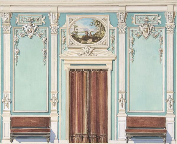 Curator: This is a fascinating late 19th-century piece titled "Interior Design for a Gray Curtained Alcove, with an Upholstered Armchair, Ottoman and Cabinet." It's currently part of the Metropolitan Museum of Art's collection, though the designer remains anonymous. Editor: The color palette strikes me first – the muted gold curtain against the pale blue walls creates a sense of subdued luxury. It’s like a stage set, carefully composed and slightly melancholic. Curator: I think that captures something essential. Considering its timeframe, around 1880 to 1900, we're looking at a society undergoing significant shifts in gender roles and class structures. This meticulously designed alcove may be understood as an attempt to articulate social aspirations within a rapidly changing world. Editor: Right, and it does convey stability. The classical column motif contrasted with what looks like an Art Nouveau style armchair points to the era's shifting visual language. The repetition of circular shapes - the ottoman, the chair's form, the rosette on the column—creates a self-contained world, almost womb-like in its feeling of enclosure. What do you think it says about how women were viewed at that time? Curator: That's insightful. We might see it as emblematic of the prescribed domestic roles for upper-class women: a haven but also a confine. Note the arrangement where every element reinforces containment and comfort. The lack of figures reinforces its isolated ambience; we can only interpret the absence by asking questions about who and what this carefully controlled domestic setting sought to represent. Editor: The single, unadorned vase within the cabinet then becomes potent—a symbol, perhaps, of feminine presence and domestic creativity carefully contained within this stylized space. I also see a reference to permanence with those stylized motifs. Curator: Yes. It becomes important to acknowledge these kinds of historical interpretations because that makes visible the way these seemingly simple arrangements convey meaning over time and in new contexts. Editor: Ultimately, this exploration makes you consider how physical spaces, especially intimate ones, shape and mirror larger social forces and individual stories. Curator: Precisely. And this dialogue illuminates that relationship from multiple critical positions, reminding us how vital interdisciplinary perspectives are in art interpretation.