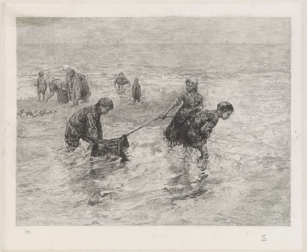 Jan Vrolijk made this etching, "Fishermen unloading a sloop on the beach," in the Netherlands in the late 19th century. At this time Dutch art increasingly focused on the everyday lives of ordinary people, and the fishing industry was central to the Dutch economy and culture. The image shows fishermen working hard to unload their catch, while a sailboat is seen in the background, and the low perspective emphasizes the flatness of the Dutch landscape. This etching provides insight into the lives of Dutch fishermen in the 19th century. We might consider it a social commentary, showing the labor and the connection between the Dutch people and the sea. To understand it more fully, we might look at historical records of the fishing industry, economic data, and other images of Dutch life from that time. These resources help us appreciate the role of art in reflecting and shaping cultural values.