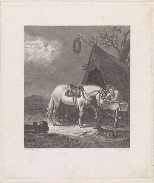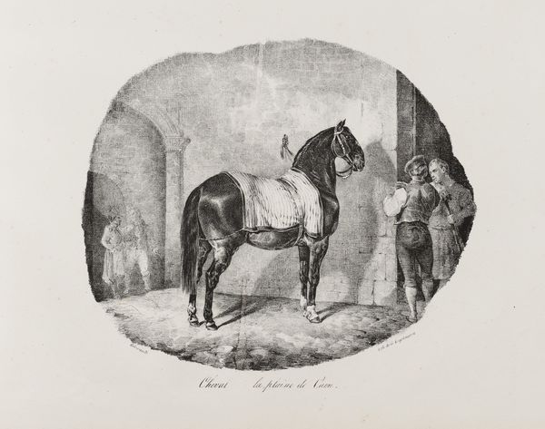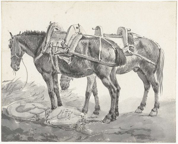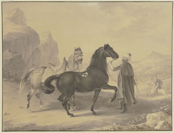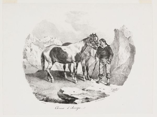 Editor: Géricault's "Horses of the Auvergne," created around 1822, is a delicate pencil drawing. It depicts a man and two horses in a mountainous landscape. It has a somewhat subdued and humble tone given its muted pencil aesthetic. What can you tell us about this piece? Curator: This work resonates within the rise of Romanticism, a cultural movement that placed high value on individualism and the experience of nature. Géricault, known for monumental history paintings, turns here to a seemingly simpler subject, however, the ‘humble’ scene touches upon complex ideas about rural life in 19th-century France. The rise of Romanticism paralleled increased interest in representing peasants, often depicted heroically, challenging urban bourgeois norms. Editor: That's interesting. So it's not just a simple depiction of horses and a man, but is also reflective of contemporary ideals? Curator: Precisely. This print enters a broader conversation regarding art's role in representing social classes and national identity during the Bourbon Restoration. Moreover, prints and drawings played an important role in creating distribution of images and cultural values at this time. Think of how this image would circulate compared to a painting! What could prints accomplish at this time? Editor: So a print like this made the idea of romanticizing the natural life and simple folk far more widespread... I hadn't considered the format contributing to its cultural impact. Curator: Absolutely, it highlights the way the piece participated in shaping a narrative of French identity through readily accessible imagery. Editor: I’ve certainly gained a new perspective on "Horses of the Auvergne" and the cultural moment that shaped its importance. Thank you!