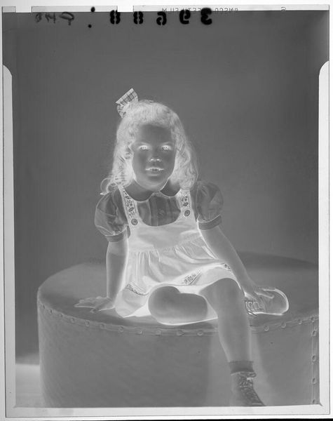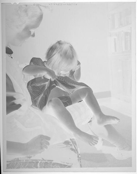 Editor: This is an untitled gelatin silver print by Lucian and Mary Brown, showing a baby held aloft, playfully, it seems. I wonder what they were feeling when they captured this moment? What's your take? Curator: It's like a snapshot of pure joy, isn't it? The negative image gives it this ethereal glow, like a memory half-remembered. I imagine them wanting to freeze this fleeting moment of connection. It's intimate, wouldn't you agree? Editor: Yes, I see what you mean. The inverted tones make it more evocative. Thanks for the insights! Curator: My pleasure. It is fascinating how artists can capture raw emotion through such simple means, isn't it?