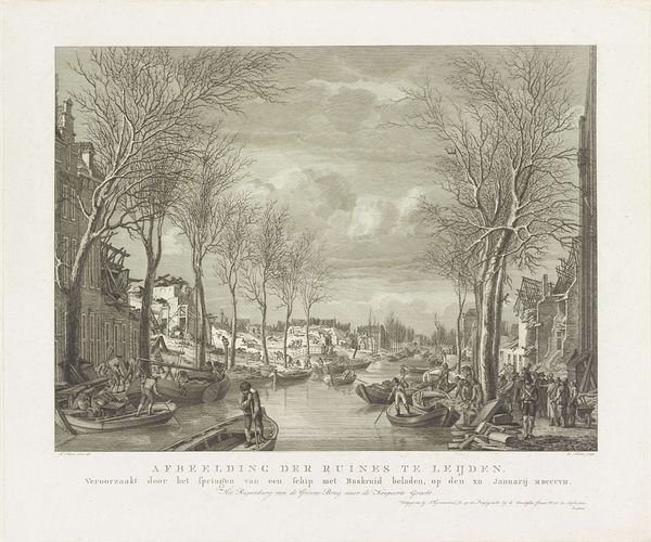 This aquatint by Joannes Bemme captures Leiden in the wake of the 1807 gunpowder explosion. Dominating the scene are the skeletal trees, stripped bare, standing as stark symbols of mortality and devastation. The image’s power lies not just in its depiction of destruction, but in how it echoes the perennial human confrontation with disaster. Consider the recurring motif of the bare tree throughout art history: from classical depictions of winter to Romantic portrayals of nature's indifference, they evoke a sense of loss. These trees, like the ruins themselves, resonate with the transience of human endeavor. The starkness of the scene, the way the figures huddle together in the face of such desolation, taps into our collective memory of catastrophe. Such imagery is not confined to any one time; it reappears across epochs, reflecting our ongoing struggle to find meaning amid chaos. These symbols of destruction have a disturbing power, engaging viewers on a subconscious level, evoking intense emotional states linked to collective experiences of trauma and resilience.